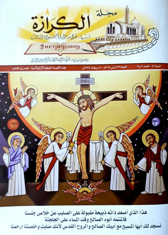 يحمل غلاف العدد الجديد من مجلة الكرازة أيقونة قبطية لصلب المسيح ذلك بمناسبة حلول أسبوع الآلام الذي يختتم بالجمعة الكبيرة والتي نحتفل فيها بتذكار الصليب المقدس.