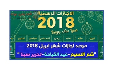 الأحد الموافق 8 أبريل بمناسبة عيد القيامة المجيد الاثنين الموافق 9 ابريل بمناسبة شم النسيم الأربعاء الموافق 25 أبريل بمناسبة عيد تحرير سيناء