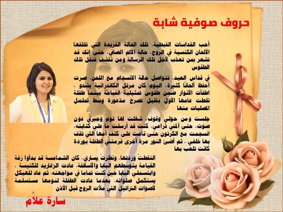 سارة علاَّم صحفية شابة تغطى أخبار وأحداث الكاتدرائية المرقسية بالعباسية ضمن مسئولياتها عن الملف القبطى فى جريدة وموقع “اليوم السابع”، ولها العديد من الدواوين الشعرية.