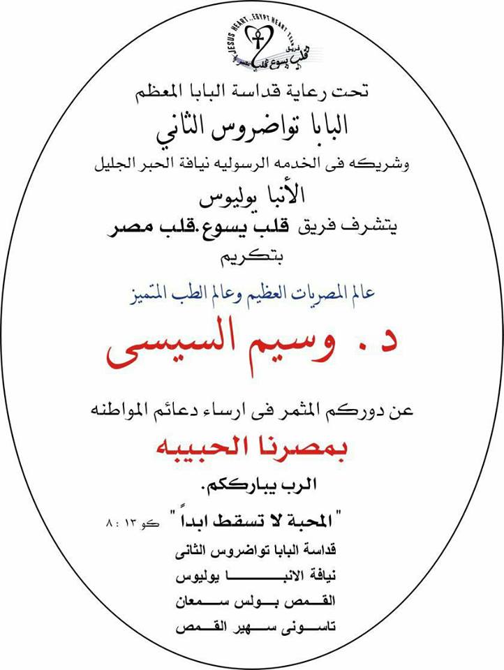 برعاية البابا تواضواس الثاني بابا الإسكندرية وبطريك الكرازة المرقسية وشريكه في الخدمة الرسولية نيافة الانبا يوليوس سيكرم فريق ” قلب يسوع “الدكتور” وسيم السيسي ” في دوره المثمر في إرساء دعائم المواطنة