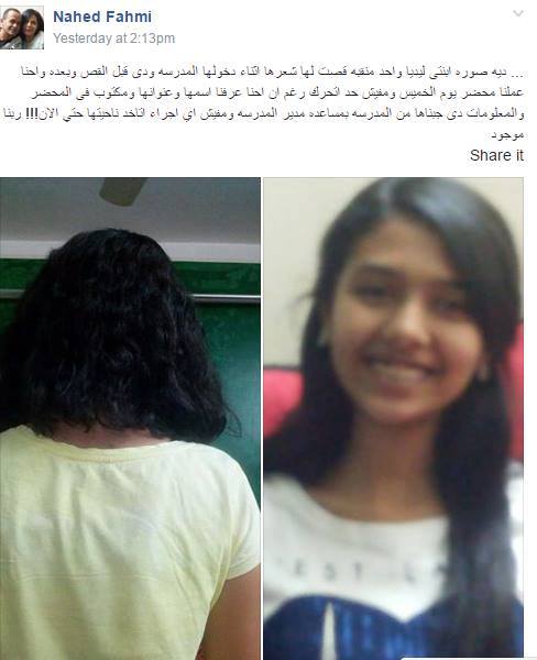جاء المنشور على صفحتها كالتالى ” ديه صوره ابنتى ليديا واحد منقبه قصت لها شعرها اثناء دخولها المدرسه ودى قبل القص وبعده واحنا عملنا محضر يوم الخميس ومفيش حد اتحرك رغم ان احنا عرفنا اسمها وعنوانها ومكتوب فى المحضر والمعلومات دى جبناها من المدرسه بمساعده مدير المدرسه ومفيش اي اجراء اتاخد ناحيتها حتي الان “