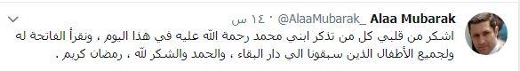 وكتب علاء مبارك في تغريدته: «أشكر من قلبي كل من تذكر ابني محمد في هذا اليوم رحمة الله عليه، ونقرأ الفاتحة له ولكل الأطفال الذين سبقونا إلى دار البقاء، والحمد والشكر لله. رمضان كريم».