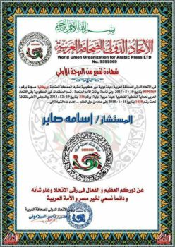 كرم الإتحاد الدولى للصحافة العربية برئاسة المستشار الدكتور ناصر السلامونى مساء أمس العديد من الشخصيات المؤثرة فى الوطن العربى من بينهم المستشار الاعلامى والكاتب السياسى أسامة صابر . وذلك تقديرا لجهودة المبذولة فى خدمة الوطن ومنح الاتحاد لـ صابر شهادة تقدير .