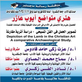 وجاءت رسالة الباحث في موضوع (تصوير الحمل في الفن المسيحي – دراسة أثرية مقارنة)