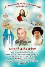 يتقدم المفكر الاقتصادى ناصر عدلى رئيس مجلس ادارة المواطنه نيوز بخالص العزاء فى ذكرى الاربعين للمتنيح فوزى مترى لاخوته الاستاذ ثروت مترى وللاسره
